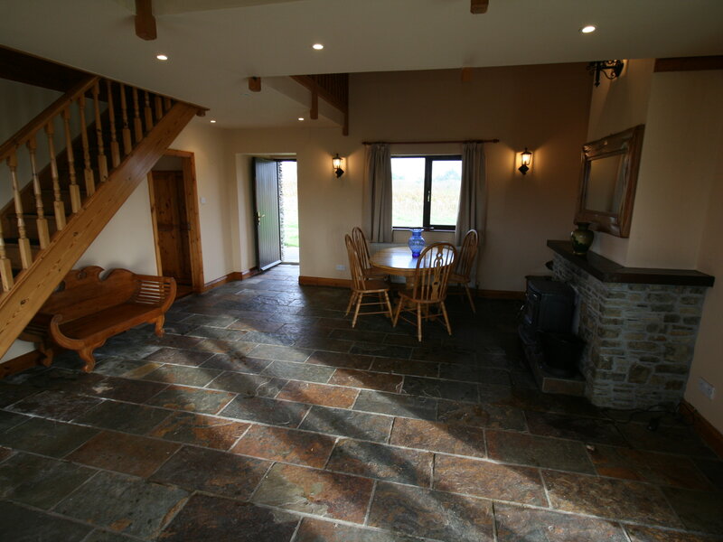 Fitted kitchen with integrated hob, dishwasher & fridge freezer Slate tile floor, Solid fuel stove & stone fireplace.